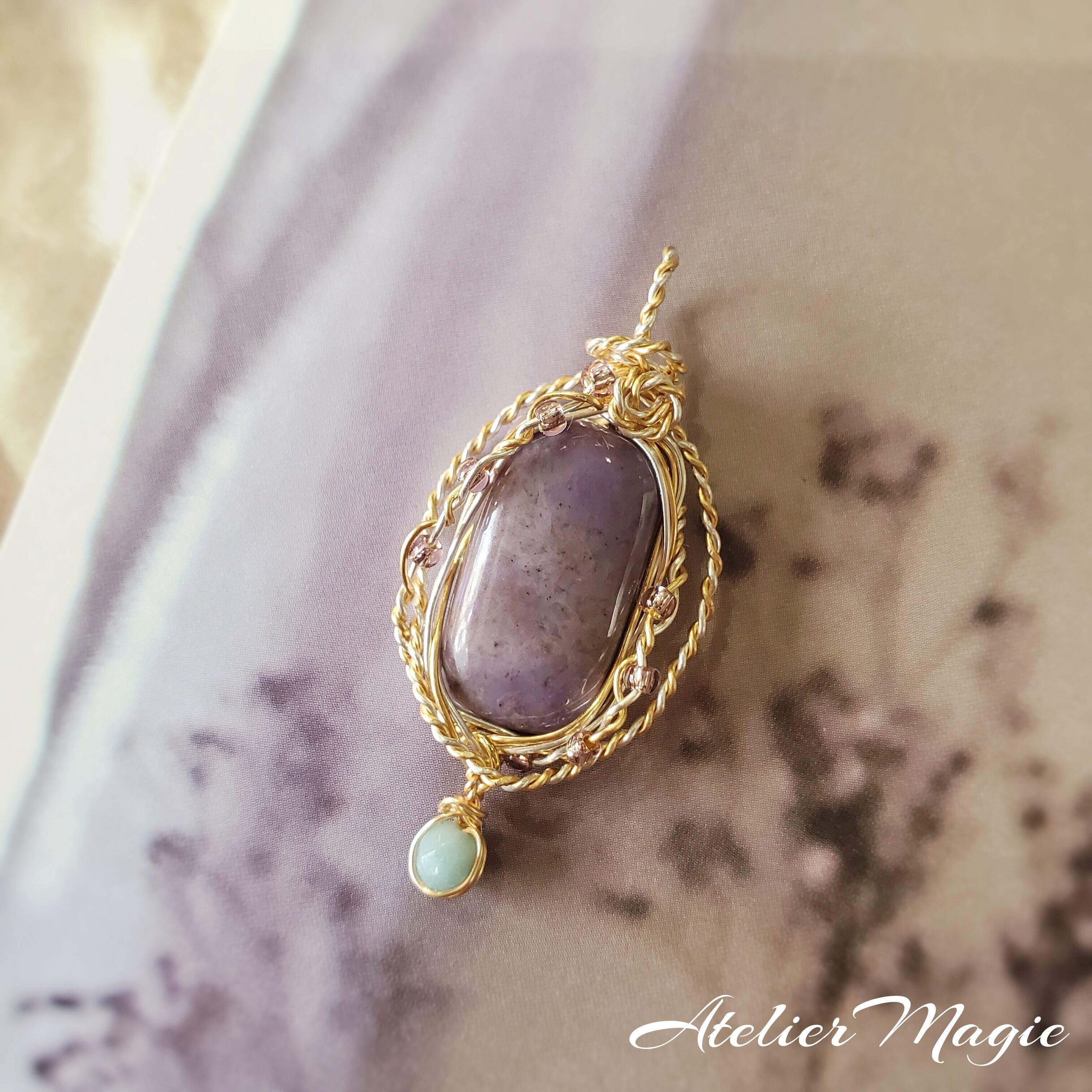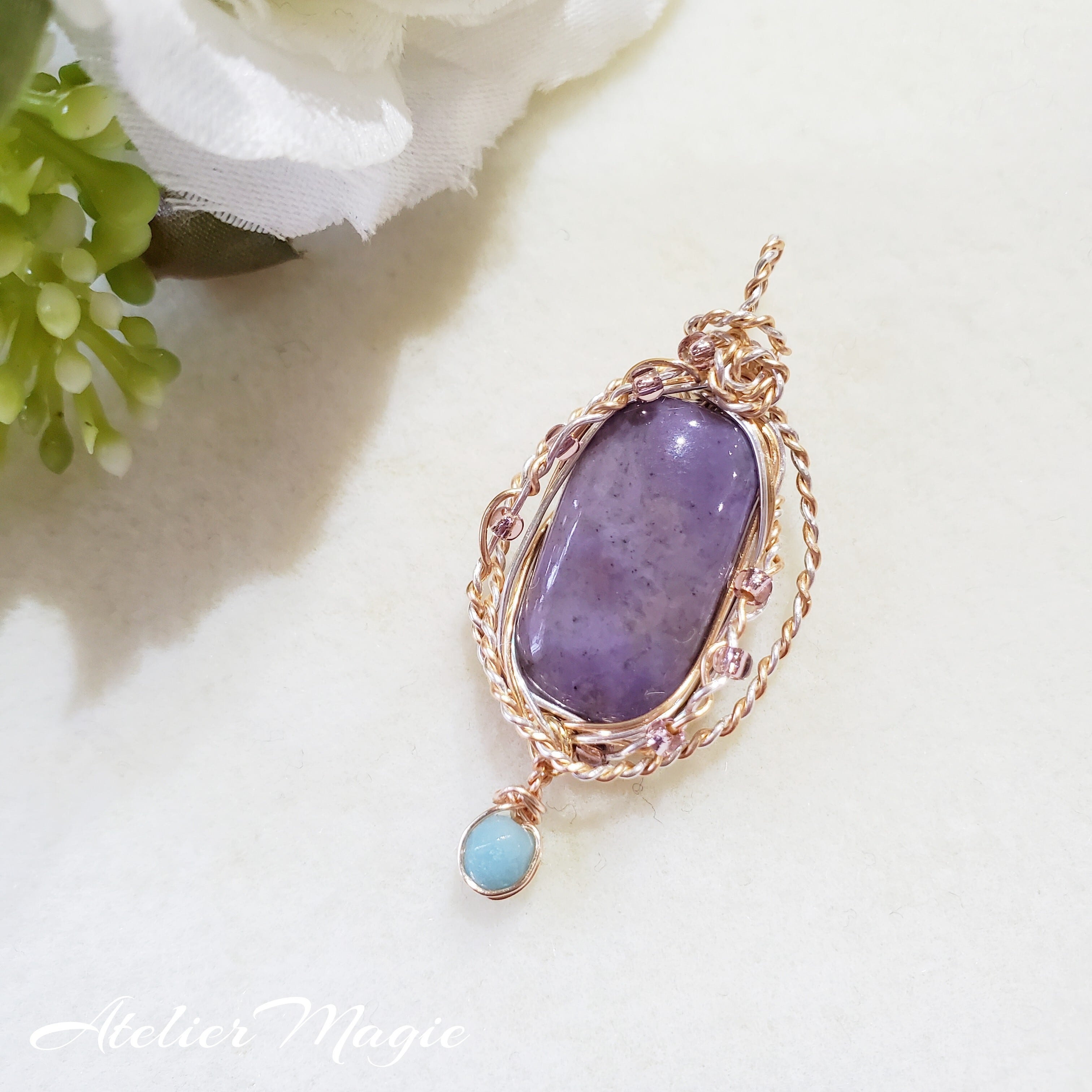 柔らかいくすみカラーの紫色と絶妙な風合いの模様が魅力的なラベンダー翡翠の四角いルースを、ワイヤーで巻き、下端にアマゾナイトの小さなビーズをあしらってペンダントトップに仕立てました。