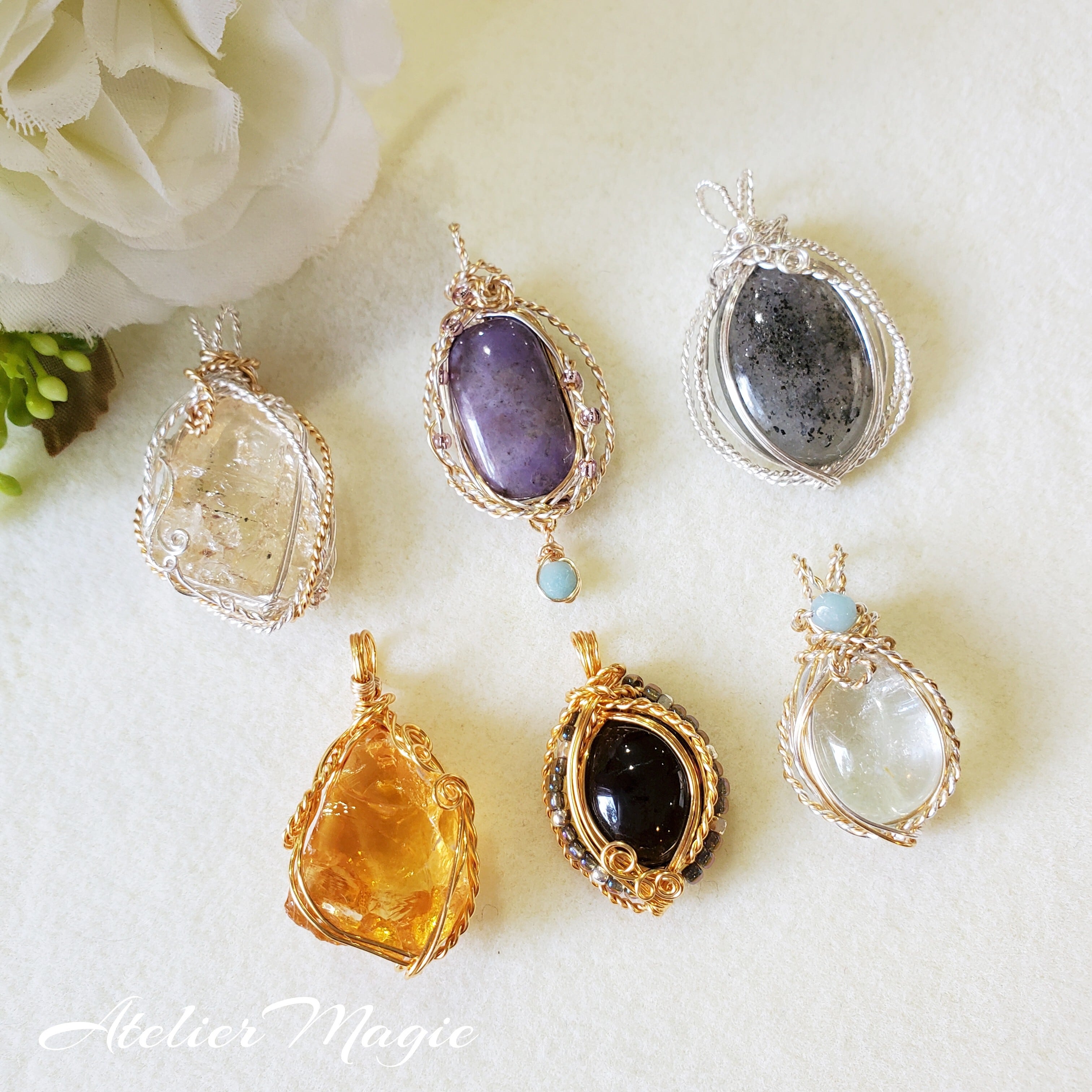 ・ハンドメイドの作品のため、強度には充分留意して制作しておりますが、市販の工業生産品に比べると繊細なつくりになっております。特に強い力を加えると石がワイヤーから外れる場合がございますのでご注意ください。