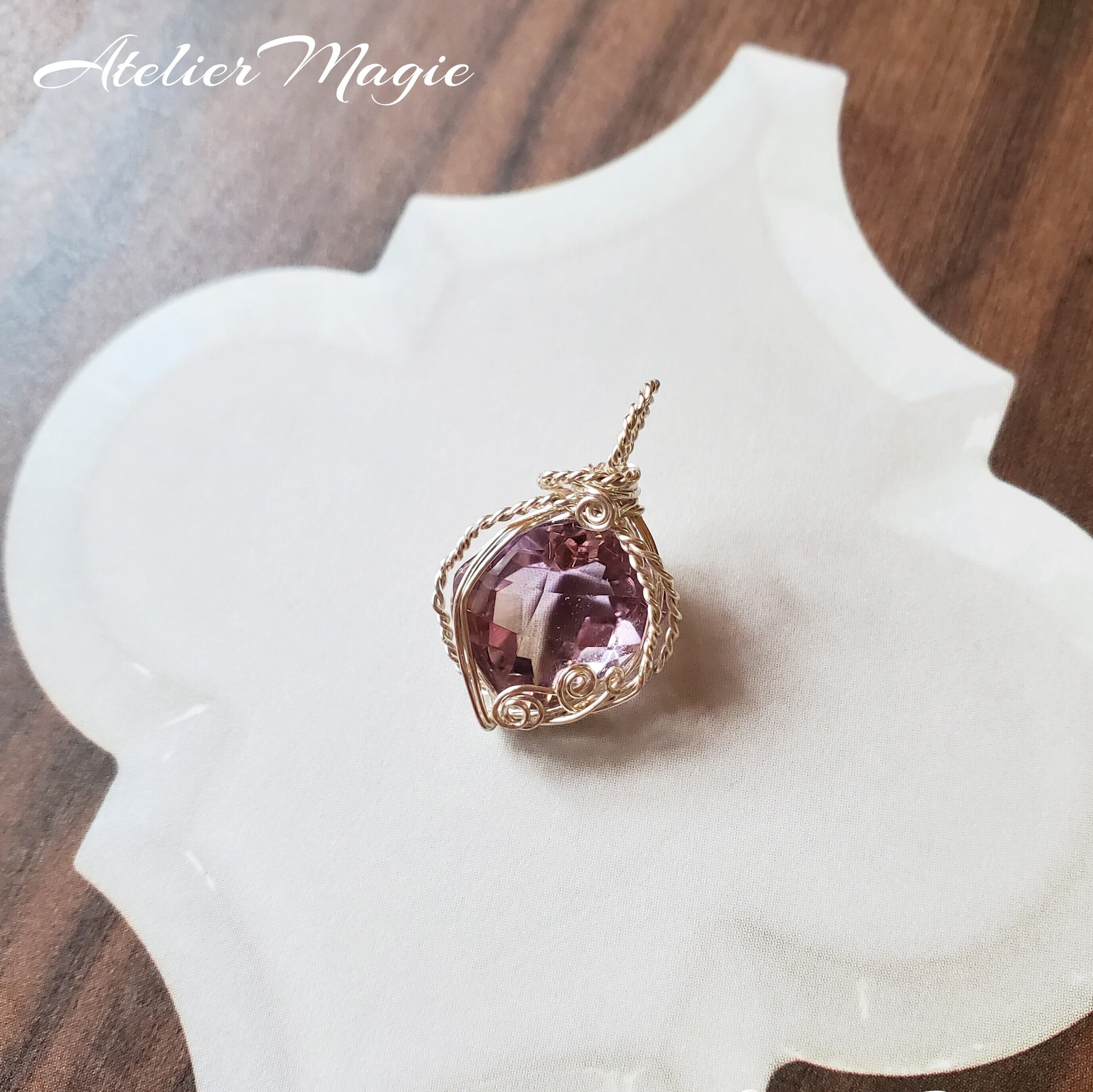 ジュエリークオリティの不規則なアシンメトリー形のアメトリンのファセットカットを、ワイヤーで巻いてペンダントトップに仕立てました。
