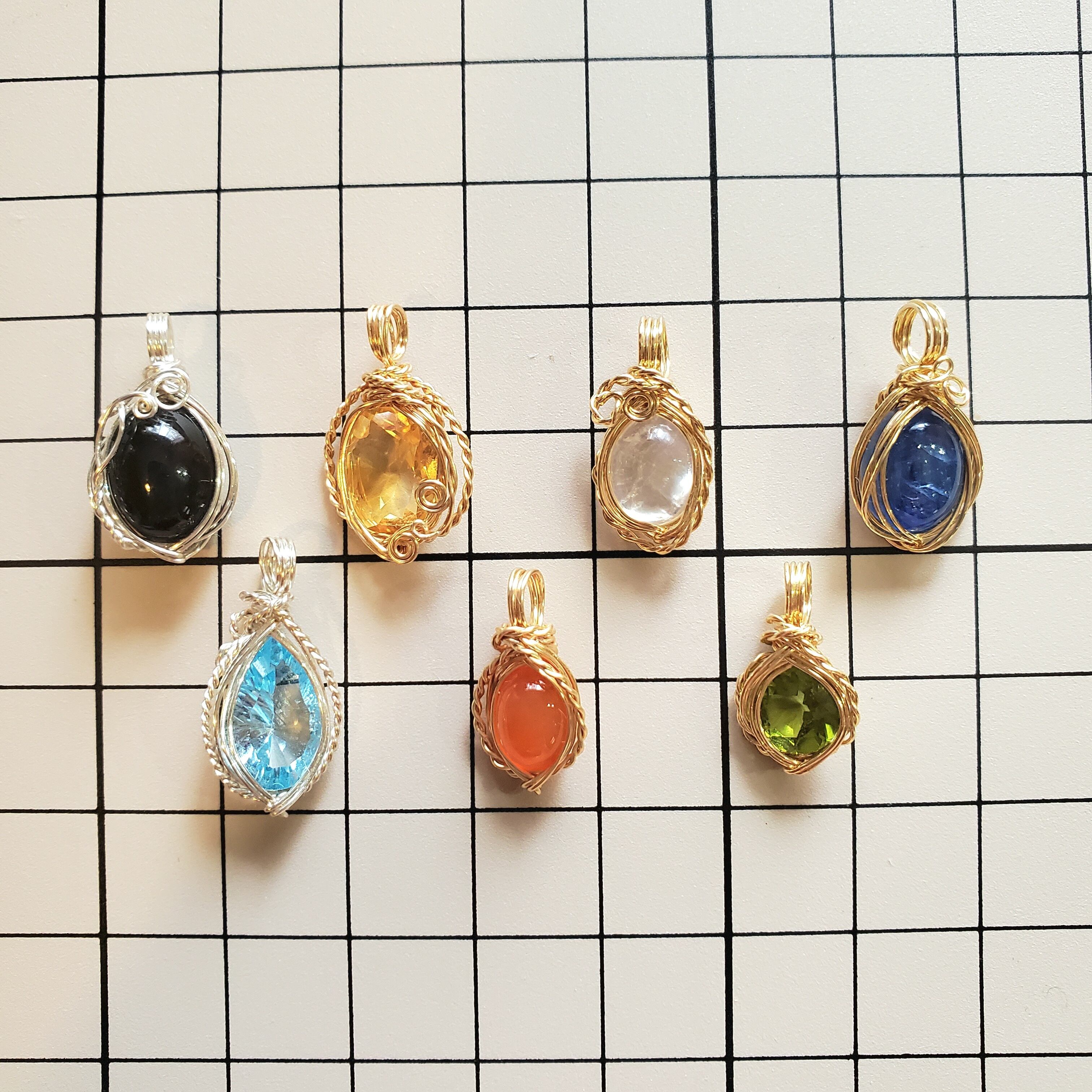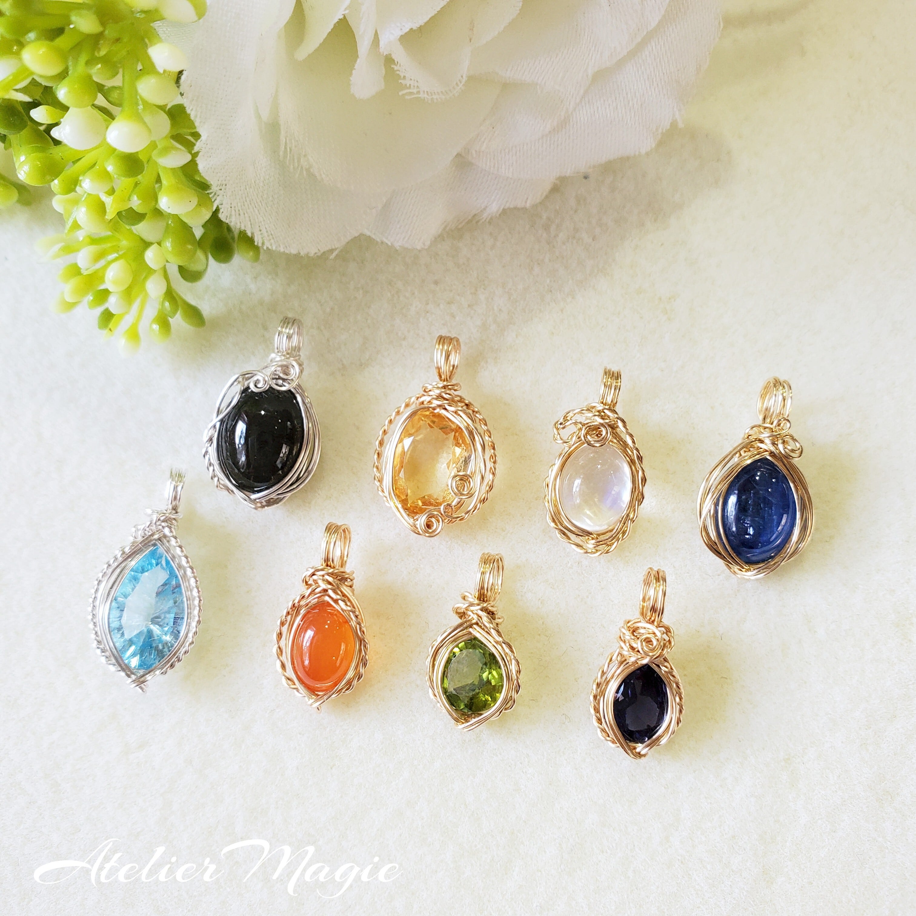 ・ハンドメイドの作品のため、強度には充分留意して制作しておりますが、市販の工業生産品に比べると繊細なつくりになっております。特に強い力を加えると石がワイヤーから外れる場合がございますのでご注意ください。