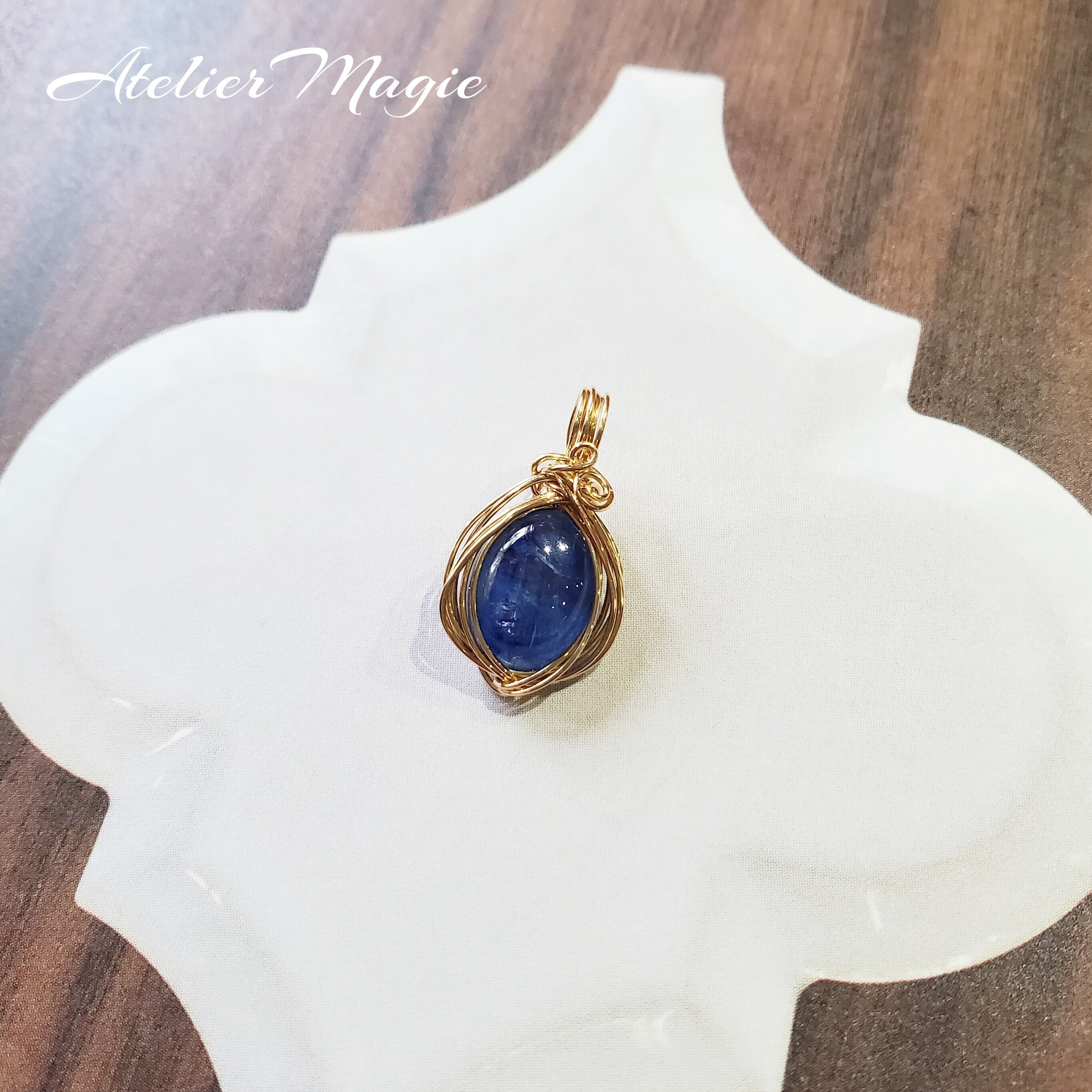 美しいブルーのカイヤナイトのオーバルカボションを、ワイヤーで巻いてペンダントトップに仕立てました。